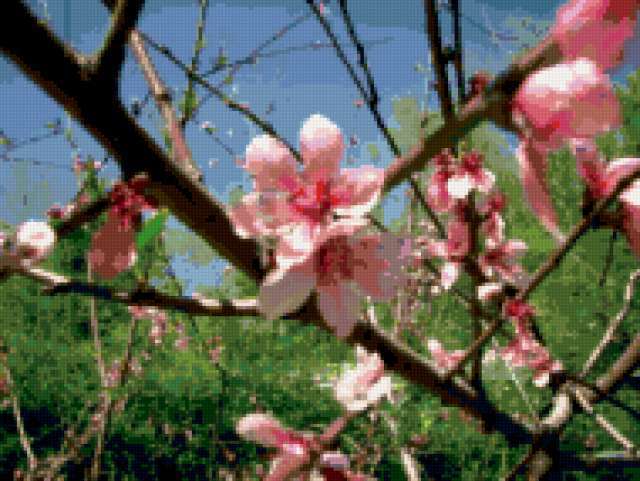 Ориентировочно так, схема вышивки «Персик», созданная автором njcbkmlf, будет выглядеть при отшиве на канве. Размер данной вышивки равен 190x143 крестов, при этом используется 76 цветов. Ключевые слова, по которым можно найти эту схему: весна, персик, ветки, дерево, пейзаж. Также, вы можете взглянуть на оригинальную картинку, соответствующую данной схеме вышивки.