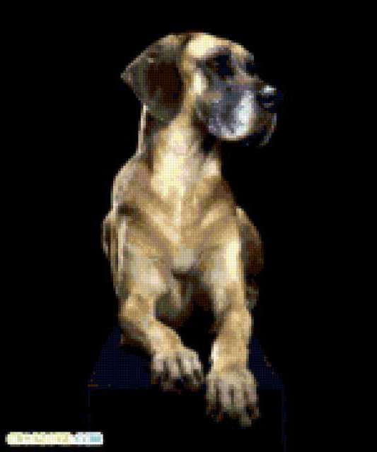 Ориентировочно так, схема вышивки «Пес», созданная автором lilya0505, будет выглядеть при отшиве на канве. Размер данной вышивки равен 150x180 крестов, при этом используется 52 цветов. Ключевые слова, по которым можно найти эту схему: животные. Также, вы можете взглянуть на оригинальную картинку, соответствующую данной схеме вышивки.