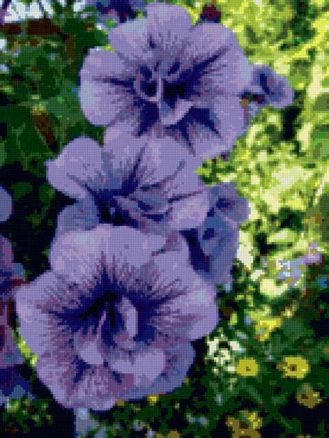 Ориентировочно так, схема вышивки «Петунии», созданная автором malkinaiv, будет выглядеть при отшиве на канве. Размер данной вышивки равен 143x190 крестов, при этом используется 44 цветов. Ключевые слова, по которым можно найти эту схему: цветы, петунии. Также, вы можете взглянуть на оригинальную картинку, соответствующую данной схеме вышивки.