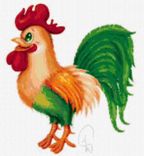 Ориентировочно так, схема вышивки «Петушок в детскую», созданная автором rybka6, будет выглядеть при отшиве на канве. Размер данной вышивки равен 175x190 крестов, при этом используется 41 цветов. Ключевые слова, по которым можно найти эту схему: детям, в детскую, сказка, птицы, петух, животные, кошка, котёнок, птички, река, ручей, деревня, природа, игра, картина. Также, вы можете взглянуть на оригинальную картинку, соответствующую данной схеме вышивки.