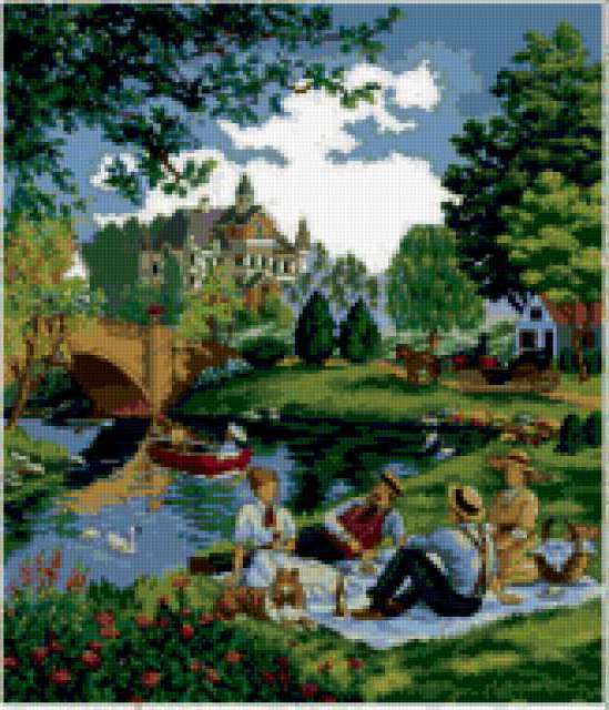 Ориентировочно так, схема вышивки «Пикник», созданная автором xa00p3857, будет выглядеть при отшиве на канве. Размер данной вышивки равен 163x190 крестов, при этом используется 79 цветов. Ключевые слова, по которым можно найти эту схему: картина, пейзаж, природа, замок, пруд, озеро, берег, лето, люди. Также, вы можете взглянуть на оригинальную картинку, соответствующую данной схеме вышивки.