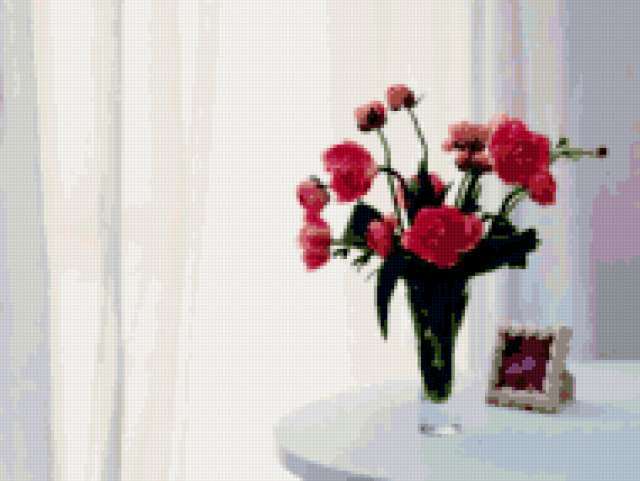 Ориентировочно так, схема вышивки «Пионы», созданная автором sim77777, будет выглядеть при отшиве на канве. Размер данной вышивки равен 190x143 крестов, при этом используется 47 цветов. Ключевые слова, по которым можно найти эту схему: пионы, цветы, букет, ваза, натюрморт. Также, вы можете взглянуть на оригинальную картинку, соответствующую данной схеме вышивки.