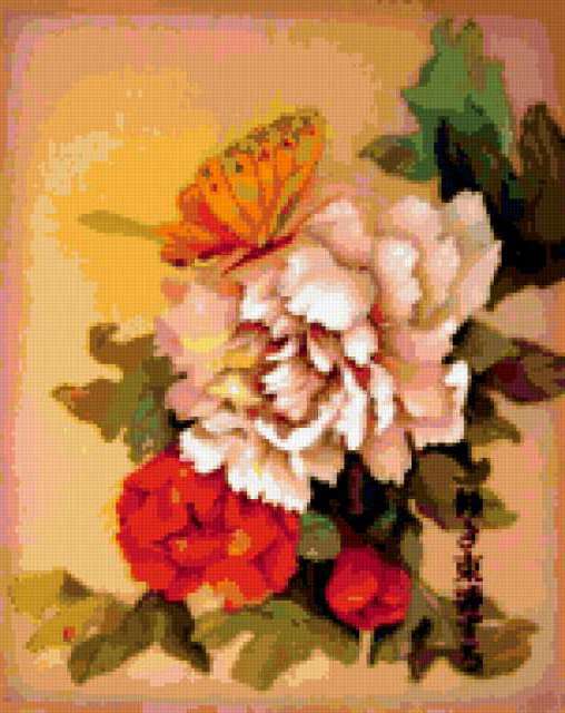 Ориентировочно так, схема вышивки «Пионы», созданная автором irenidanna, будет выглядеть при отшиве на канве. Размер данной вышивки равен 151x190 крестов, при этом используется 59 цветов. Ключевые слова, по которым можно найти эту схему: цветы, пионы, батик. Также, вы можете взглянуть на оригинальную картинку, соответствующую данной схеме вышивки.