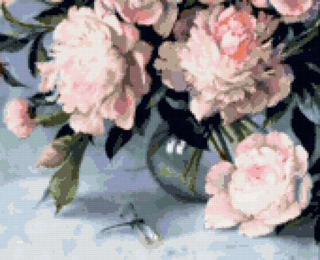 Ориентировочно так, схема вышивки «Пионы», созданная автором poltanya, будет выглядеть при отшиве на канве. Размер данной вышивки равен 170x138 крестов, при этом используется 41 цветов. Ключевые слова, по которым можно найти эту схему: пионы, пион, стрекозка, нежные лепестки, букет, цветы, флора, букеты, цветочки, картина, живопись, искусство. Также, вы можете взглянуть на оригинальную картинку, соответствующую данной схеме вышивки.