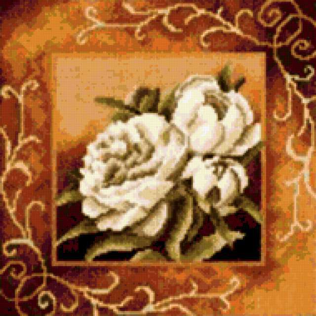 Ориентировочно так, схема вышивки «Пионы», созданная автором margoritag, будет выглядеть при отшиве на канве. Размер данной вышивки равен 190x190 крестов, при этом используется 59 цветов. Ключевые слова, по которым можно найти эту схему: подушка, цветы, рисунок, картинка, разное, пионы. Также, вы можете взглянуть на оригинальную картинку, соответствующую данной схеме вышивки.