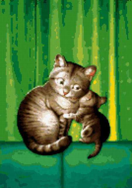 Ориентировочно так, схема вышивки «По секрету», созданная автором vesnyshka63, будет выглядеть при отшиве на канве. Размер данной вышивки равен 134x190 крестов, при этом используется 51 цветов. Ключевые слова, по которым можно найти эту схему: живопись, животные, детям, кошки. Также, вы можете взглянуть на оригинальную картинку, соответствующую данной схеме вышивки.