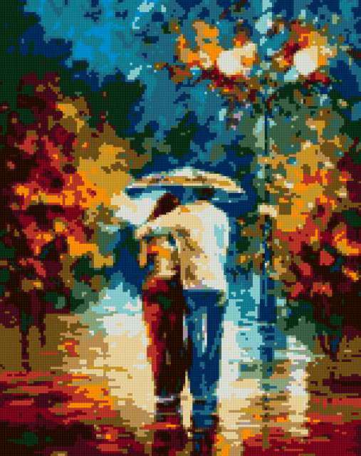 Ориентировочно так, схема вышивки «Под дождем», созданная автором Kooprina, будет выглядеть при отшиве на канве. Размер данной вышивки равен 150x189 крестов, при этом используется 20 цветов. К несчастью, автор не назначил для схемы ключевые слова. Также, вы можете взглянуть на оригинальную картинку, соответствующую данной схеме вышивки.