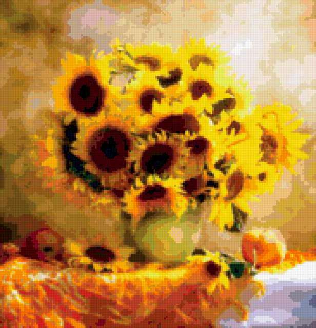Ориентировочно так, схема вышивки «Под" солнышки», созданная автором bosya, будет выглядеть при отшиве на канве. Размер данной вышивки равен 183x190 крестов, при этом используется 73 цветов. Ключевые слова, по которым можно найти эту схему: букет, ваза, подсолнухи. Также, вы можете взглянуть на оригинальную картинку, соответствующую данной схеме вышивки.