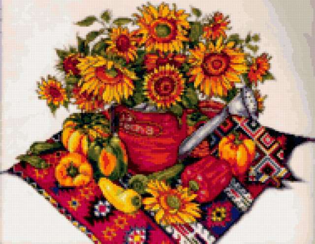 Ориентировочно так, схема вышивки «Подсолнухи и лейка», созданная автором lucha, будет выглядеть при отшиве на канве. Размер данной вышивки равен 190x147 крестов, при этом используется 80 цветов. Ключевые слова, по которым можно найти эту схему: подсолнухи, цветы. Также, вы можете взглянуть на оригинальную картинку, соответствующую данной схеме вышивки.