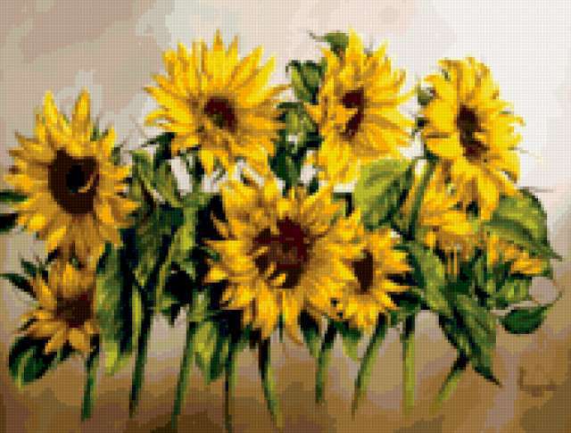 Ориентировочно так, схема вышивки «Подсолнухи», созданная автором Fardo, будет выглядеть при отшиве на канве. Размер данной вышивки равен 190x144 крестов, при этом используется 66 цветов. Ключевые слова, по которым можно найти эту схему: цветы, букет, подсолнухи. Также, вы можете взглянуть на оригинальную картинку, соответствующую данной схеме вышивки.