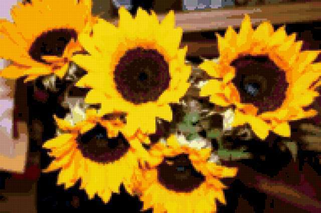 Ориентировочно так, схема вышивки «Подсолнухи», созданная автором malkinaiv, будет выглядеть при отшиве на канве. Размер данной вышивки равен 190x126 крестов, при этом используется 61 цветов. Ключевые слова, по которым можно найти эту схему: цветы, подсолнухи. Также, вы можете взглянуть на оригинальную картинку, соответствующую данной схеме вышивки.