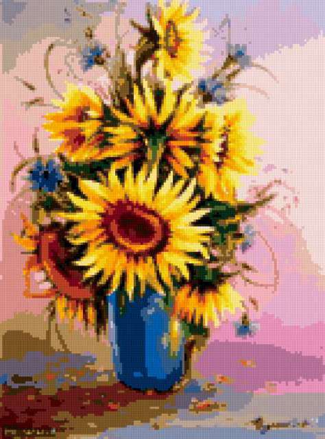 Ориентировочно так, схема вышивки «Подсолнухи», созданная автором Svetlisha, будет выглядеть при отшиве на канве. Размер данной вышивки равен 141x190 крестов, при этом используется 36 цветов. Ключевые слова, по которым можно найти эту схему: цветы, букет, подсолнухи. Также, вы можете взглянуть на оригинальную картинку, соответствующую данной схеме вышивки.