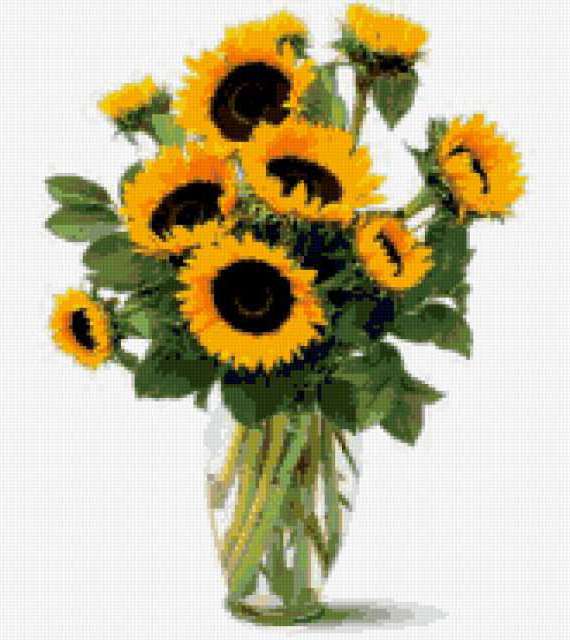 Ориентировочно так, схема вышивки «Подсолнухи», созданная автором Lara10kl, будет выглядеть при отшиве на канве. Размер данной вышивки равен 165x185 крестов, при этом используется 40 цветов. Ключевые слова, по которым можно найти эту схему: ваза, подсолнухи, цветы. Также, вы можете взглянуть на оригинальную картинку, соответствующую данной схеме вышивки.