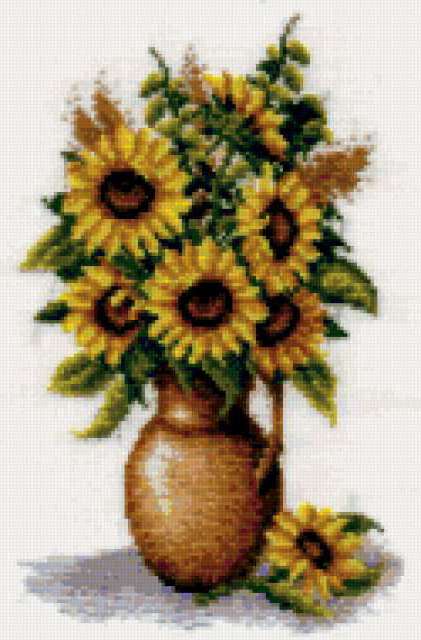 Ориентировочно так, схема вышивки «Подсолнухи», созданная автором xa00p3857, будет выглядеть при отшиве на канве. Размер данной вышивки равен 125x190 крестов, при этом используется 78 цветов. Ключевые слова, по которым можно найти эту схему: натюрморт, цветы, букет, подсолнухи, ваза. Также, вы можете взглянуть на оригинальную картинку, соответствующую данной схеме вышивки.