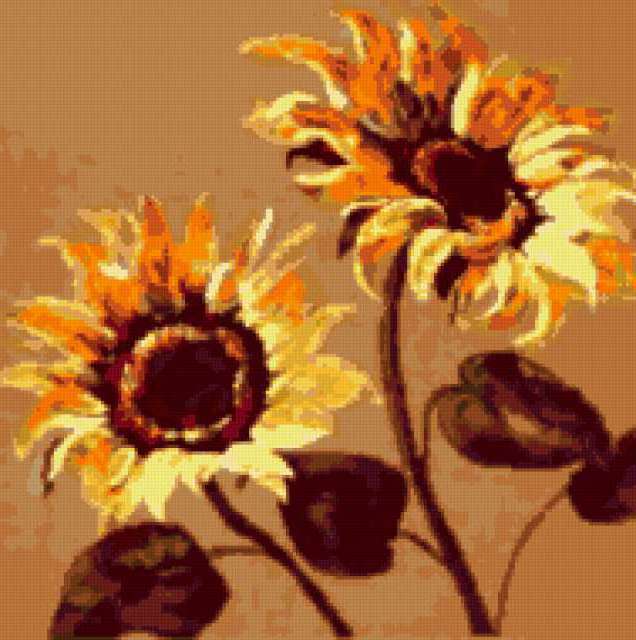 Ориентировочно так, схема вышивки «Подсолнухи», созданная автором ze79, будет выглядеть при отшиве на канве. Размер данной вышивки равен 189x190 крестов, при этом используется 25 цветов. Ключевые слова, по которым можно найти эту схему: подушка, подсолнухи. Также, вы можете взглянуть на оригинальную картинку, соответствующую данной схеме вышивки.