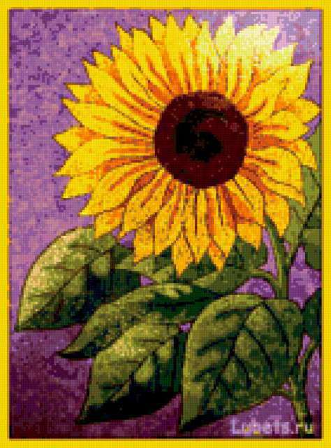 Ориентировочно так, схема вышивки «Подсолнух», созданная автором antik-1974, будет выглядеть при отшиве на канве. Размер данной вышивки равен 141x190 крестов, при этом используется 59 цветов. Ключевые слова, по которым можно найти эту схему: подсолнухи, ваза, цветы, картина, букет. Также, вы можете взглянуть на оригинальную картинку, соответствующую данной схеме вышивки.