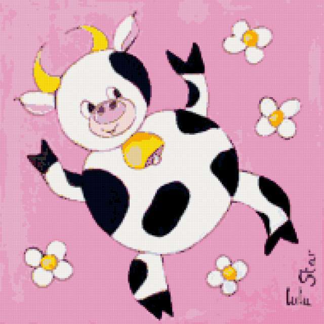 Ориентировочно так, схема вышивки «Подушка "Коровка"», созданная автором poltanya, будет выглядеть при отшиве на канве. Размер данной вышивки равен 190x190 крестов, при этом используется 22 цветов. Ключевые слова, по которым можно найти эту схему: корова, коровы, бурёнка, коровка, васильки, василёк, венок, цветы, подушка, подушки, детские сюжеты. Также, вы можете взглянуть на оригинальную картинку, соответствующую данной схеме вышивки.