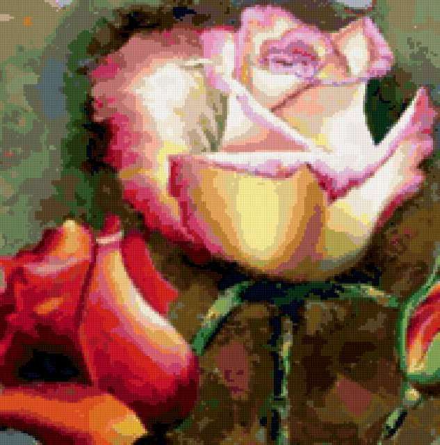 Ориентировочно так, схема вышивки «Подушка - "Розы"», созданная автором Sineglazka, будет выглядеть при отшиве на канве. Размер данной вышивки равен 188x190 крестов, при этом используется 65 цветов. Ключевые слова, по которым можно найти эту схему: подушка, цветы, розы. Также, вы можете взглянуть на оригинальную картинку, соответствующую данной схеме вышивки.