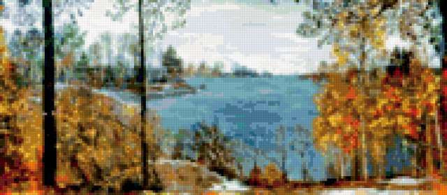 Ориентировочно так, схема вышивки «Поздняя осень», созданная автором malkinaiv, будет выглядеть при отшиве на канве. Размер данной вышивки равен 190x83 крестов, при этом используется 82 цветов. Ключевые слова, по которым можно найти эту схему: искусство, живопись, картина, пейзаж, озеро, деревья, природа, осень. Также, вы можете взглянуть на оригинальную картинку, соответствующую данной схеме вышивки.
