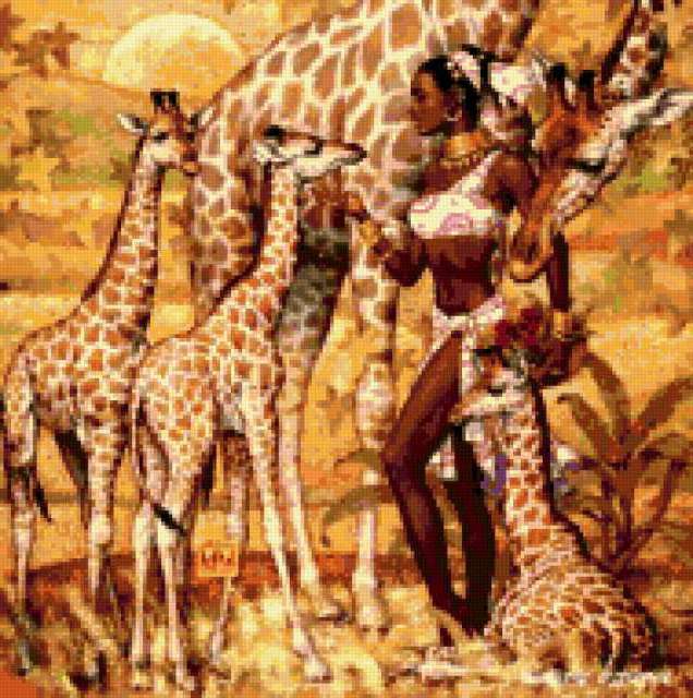 Ориентировочно так, схема вышивки «Покровительница жирафов», созданная автором irkaaa, будет выглядеть при отшиве на канве. Размер данной вышивки равен 189x190 крестов, при этом используется 52 цветов. Ключевые слова, по которым можно найти эту схему: жираф, люди. Также, вы можете взглянуть на оригинальную картинку, соответствующую данной схеме вышивки.