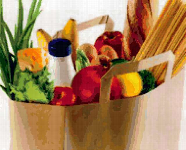 Ориентировочно так, схема вышивки «Покупки», созданная автором -26265-, будет выглядеть при отшиве на канве. Размер данной вышивки равен 190x153 крестов, при этом используется 79 цветов. Ключевые слова, по которым можно найти эту схему: покупки, еда, пакет, продукты. Также, вы можете взглянуть на оригинальную картинку, соответствующую данной схеме вышивки.