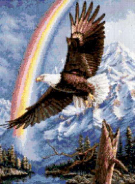 Ориентировочно так, схема вышивки «Полет», созданная автором afrikana, будет выглядеть при отшиве на канве. Размер данной вышивки равен 140x190 крестов, при этом используется 75 цветов. Ключевые слова, по которым можно найти эту схему: полет, орел, птица. Также, вы можете взглянуть на оригинальную картинку, соответствующую данной схеме вышивки.