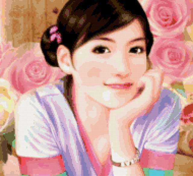 Ориентировочно так, схема вышивки «Портрет азиатской девушки», созданная автором rybka6, будет выглядеть при отшиве на канве. Размер данной вышивки равен 190x173 крестов, при этом используется 59 цветов. Ключевые слова, по которым можно найти эту схему: портрет, девушка, волосы, астры, ирис, ретро, цветы, хризантемы, пчела, локоны, глаза, бабочка, венок, живопись, картина, искусство. Также, вы можете взглянуть на оригинальную картинку, соответствующую данной схеме вышивки.