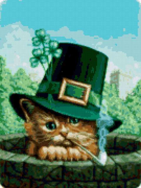 Ориентировочно так, схема вышивки «Посидим - покурим..», созданная автором olich-pushistik, будет выглядеть при отшиве на канве. Размер данной вышивки равен 135x180 крестов, при этом используется 55 цветов. Ключевые слова, по которым можно найти эту схему: животные, кошки, кошка, морда, шляпа, трубка, колодец, клевер, четырехлистник, рыжее, красиво. Также, вы можете взглянуть на оригинальную картинку, соответствующую данной схеме вышивки.