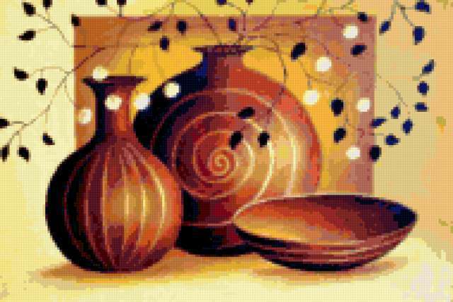 Ориентировочно так, схема вышивки «Посуда», созданная автором Luda49, будет выглядеть при отшиве на канве. Размер данной вышивки равен 190x127 крестов, при этом используется 46 цветов. К несчастью, автор не назначил для схемы ключевые слова. Также, вы можете взглянуть на оригинальную картинку, соответствующую данной схеме вышивки.
