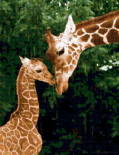 Ориентировочно так, схема вышивки «Прелесть...», созданная автором katusha_orhideya, будет выглядеть при отшиве на канве. Размер данной вышивки равен 146x190 крестов, при этом используется 52 цветов. Ключевые слова, по которым можно найти эту схему: жираф, животные, мама, ребенок, природа, красота, поцелуй, любовь. Также, вы можете взглянуть на оригинальную картинку, соответствующую данной схеме вышивки.