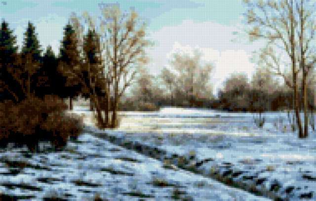 Ориентировочно так, схема вышивки «Приближение весны», созданная автором palena29, будет выглядеть при отшиве на канве. Размер данной вышивки равен 190x121 крестов, при этом используется 70 цветов. Ключевые слова, по которым можно найти эту схему: живопись, пейзаж, весна. Также, вы можете взглянуть на оригинальную картинку, соответствующую данной схеме вышивки.