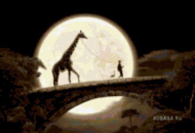 Ориентировочно так, схема вышивки «Прогулка», созданная автором alena4, будет выглядеть при отшиве на канве. Размер данной вышивки равен 190x130 крестов, при этом используется 47 цветов. Ключевые слова, по которым можно найти эту схему: луна, жираф, дети. Также, вы можете взглянуть на оригинальную картинку, соответствующую данной схеме вышивки.