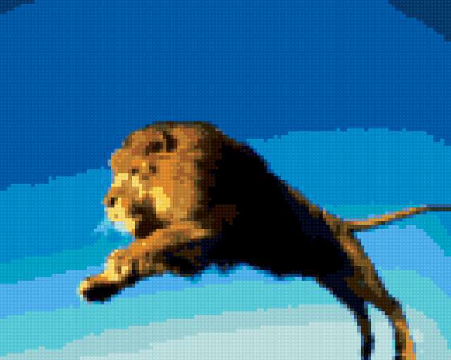 Ориентировочно так, схема вышивки «Прыжок», созданная автором Paramore, будет выглядеть при отшиве на канве. Размер данной вышивки равен 130x104 крестов, при этом используется 26 цветов. Ключевые слова, по которым можно найти эту схему: лев, царь зверей. Также, вы можете взглянуть на оригинальную картинку, соответствующую данной схеме вышивки.