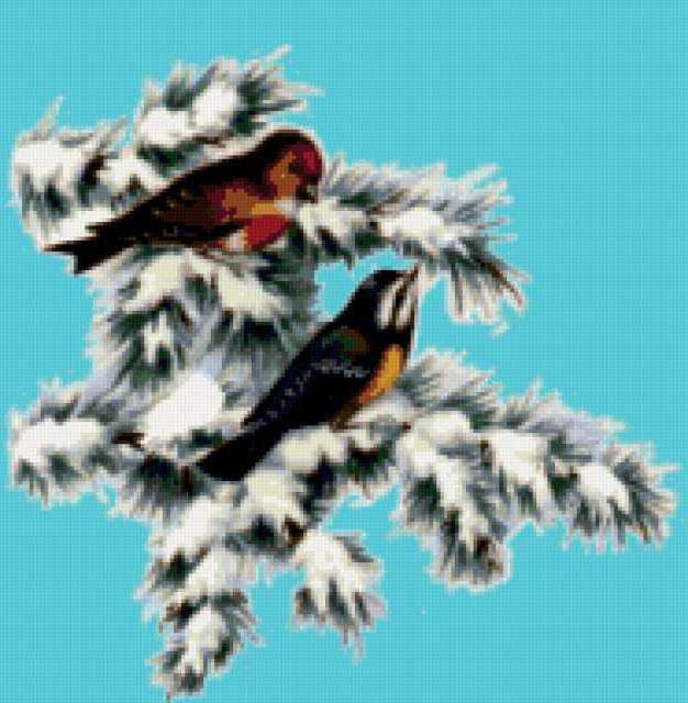 Ориентировочно так, схема вышивки «Птички», созданная автором vesnyshka63, будет выглядеть при отшиве на канве. Размер данной вышивки равен 186x190 крестов, при этом используется 58 цветов. Ключевые слова, по которым можно найти эту схему: открытка, птицы. Также, вы можете взглянуть на оригинальную картинку, соответствующую данной схеме вышивки.