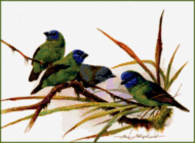 Ориентировочно так, схема вышивки «Птички», созданная автором VA903M, будет выглядеть при отшиве на канве. Размер данной вышивки равен 190x140 крестов, при этом используется 65 цветов. Ключевые слова, по которым можно найти эту схему: птицы, птичка, картина. Также, вы можете взглянуть на оригинальную картинку, соответствующую данной схеме вышивки.