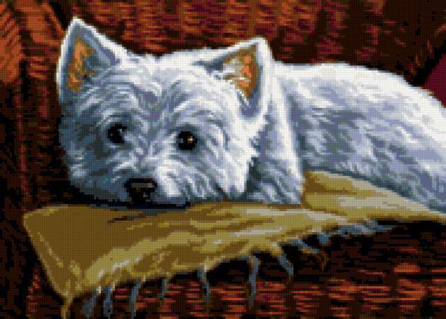 Ориентировочно так, схема вышивки «Пёсик», созданная автором VA903M, будет выглядеть при отшиве на канве. Размер данной вышивки равен 190x136 крестов, при этом используется 46 цветов. Ключевые слова, по которым можно найти эту схему: щенок, собака, пёс. Также, вы можете взглянуть на оригинальную картинку, соответствующую данной схеме вышивки.
