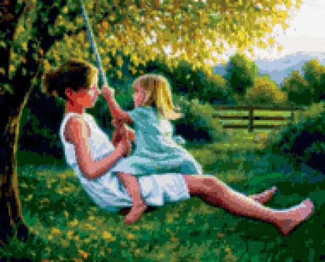 Ориентировочно так, схема вышивки «Радостное детство», созданная автором rybka6, будет выглядеть при отшиве на канве. Размер данной вышивки равен 190x153 крестов, при этом используется 71 цветов. Ключевые слова, по которым можно найти эту схему: дети, девочка, девочки, подружки, сестрички, сестра, качели, игра, картина, живопись, искусство. Также, вы можете взглянуть на оригинальную картинку, соответствующую данной схеме вышивки.
