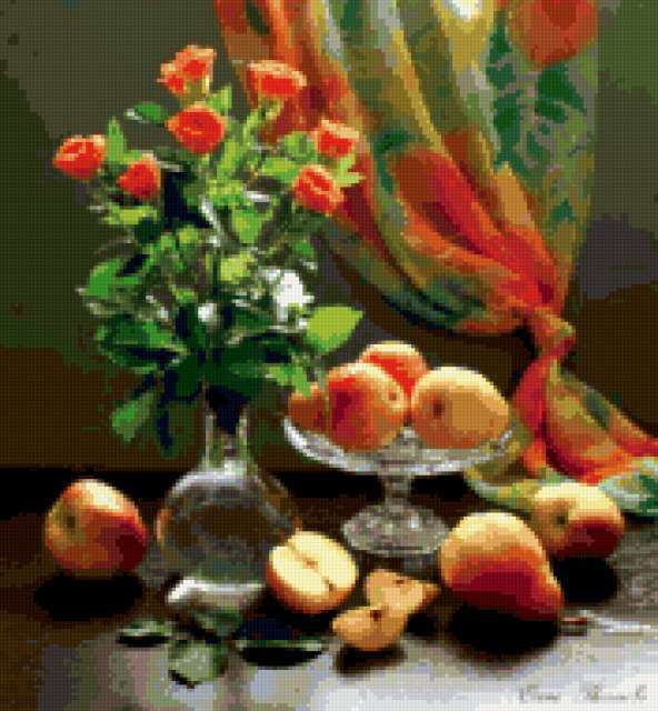 Ориентировочно так, схема вышивки «Радость жизни.», созданная автором svobodna-7, будет выглядеть при отшиве на канве. Размер данной вышивки равен 176x190 крестов, при этом используется 78 цветов. Ключевые слова, по которым можно найти эту схему: розы, фрукты, ваза, букет, шторы, натюрмрт, лето, яблоки, груши, картина. Также, вы можете взглянуть на оригинальную картинку, соответствующую данной схеме вышивки.