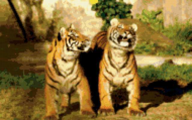 Ориентировочно так, схема вышивки «Разговор по душам», созданная автором Natali82, будет выглядеть при отшиве на канве. Размер данной вышивки равен 190x119 крестов, при этом используется 70 цветов. Ключевые слова, по которым можно найти эту схему: животные, тигр, кошки. Также, вы можете взглянуть на оригинальную картинку, соответствующую данной схеме вышивки.