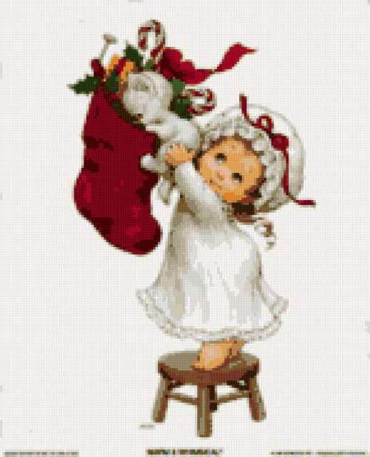 Ориентировочно так, схема вышивки «Ребёнок в Рождество2», созданная автором victoria133, будет выглядеть при отшиве на канве. Размер данной вышивки равен 150x185 крестов, при этом используется 28 цветов. Ключевые слова, по которым можно найти эту схему: новый год. Также, вы можете взглянуть на оригинальную картинку, соответствующую данной схеме вышивки.