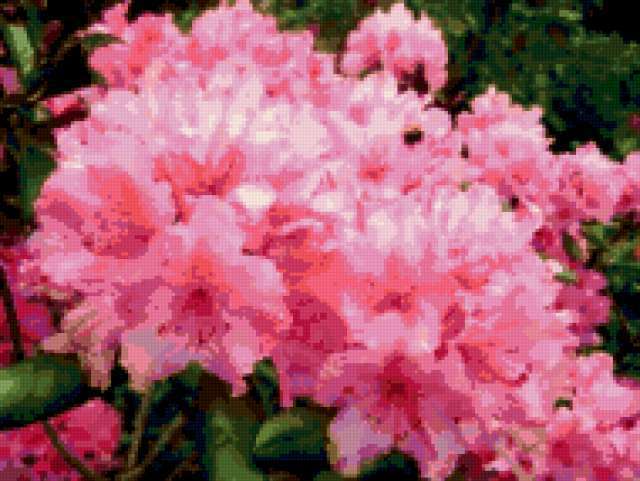 Ориентировочно так, схема вышивки «Рододендрон», созданная автором doxy, будет выглядеть при отшиве на канве. Размер данной вышивки равен 190x143 крестов, при этом используется 55 цветов. Ключевые слова, по которым можно найти эту схему: цветы, весна. Также, вы можете взглянуть на оригинальную картинку, соответствующую данной схеме вышивки.