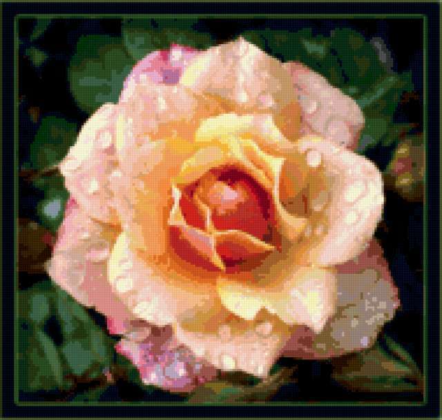 Ориентировочно так, схема вышивки «Роза в каплях», созданная автором Lenok8830, будет выглядеть при отшиве на канве. Размер данной вышивки равен 190x181 крестов, при этом используется 77 цветов. Ключевые слова, по которым можно найти эту схему: роза, чайная, цветок, капли, роса. Также, вы можете взглянуть на оригинальную картинку, соответствующую данной схеме вышивки.