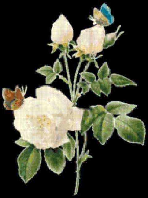 Ориентировочно так, схема вышивки «Роза и бабочки», созданная автором vesnyshka63, будет выглядеть при отшиве на канве. Размер данной вышивки равен 142x190 крестов, при этом используется 55 цветов. Ключевые слова, по которым можно найти эту схему: открытка, живопись, цветы, роза, бабочка. Также, вы можете взглянуть на оригинальную картинку, соответствующую данной схеме вышивки.