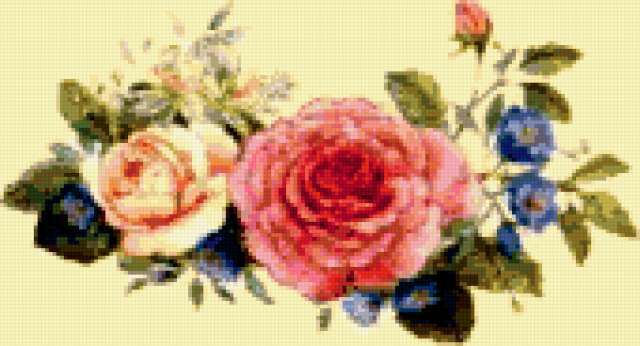 Ориентировочно так, схема вышивки «Роза», созданная автором alona777, будет выглядеть при отшиве на канве. Размер данной вышивки равен 170x92 крестов, при этом используется 69 цветов. Ключевые слова, по которым можно найти эту схему: цветы, роза, букет, флора, розы. Также, вы можете взглянуть на оригинальную картинку, соответствующую данной схеме вышивки.