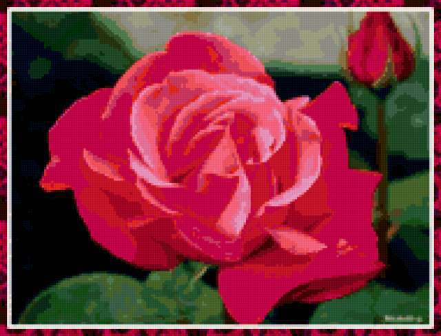 Ориентировочно так, схема вышивки «Роза», созданная автором palena29, будет выглядеть при отшиве на канве. Размер данной вышивки равен 190x145 крестов, при этом используется 53 цветов. Ключевые слова, по которым можно найти эту схему: флора, цветы, роза. Также, вы можете взглянуть на оригинальную картинку, соответствующую данной схеме вышивки.