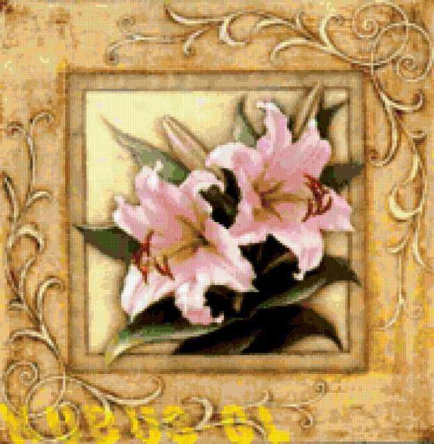 Ориентировочно так, схема вышивки «Розовые лилии», созданная автором xa00p3857, будет выглядеть при отшиве на канве. Размер данной вышивки равен 186x190 крестов, при этом используется 75 цветов. Ключевые слова, по которым можно найти эту схему: цветы, лилии, узор, орнамент, декор. Также, вы можете взглянуть на оригинальную картинку, соответствующую данной схеме вышивки.