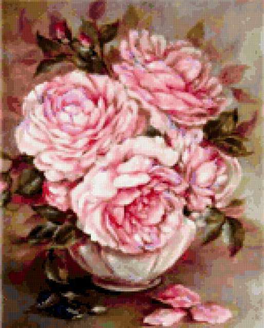 Ориентировочно так, схема вышивки «Розовые цветы», созданная автором seleniya, будет выглядеть при отшиве на канве. Размер данной вышивки равен 151x188 крестов, при этом используется 84 цветов. Ключевые слова, по которым можно найти эту схему: розы, роза, цветы, букет, ваза, картинка. Также, вы можете взглянуть на оригинальную картинку, соответствующую данной схеме вышивки.