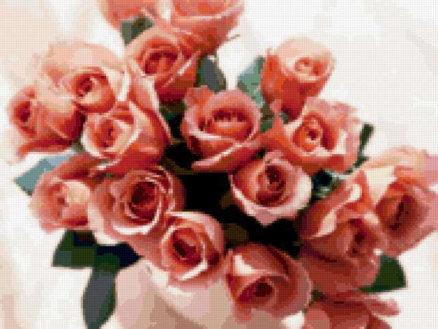 Ориентировочно так, схема вышивки «Розовый букет», созданная автором palena29, будет выглядеть при отшиве на канве. Размер данной вышивки равен 190x143 крестов, при этом используется 67 цветов. Ключевые слова, по которым можно найти эту схему: флора, цветы, розы. Также, вы можете взглянуть на оригинальную картинку, соответствующую данной схеме вышивки.