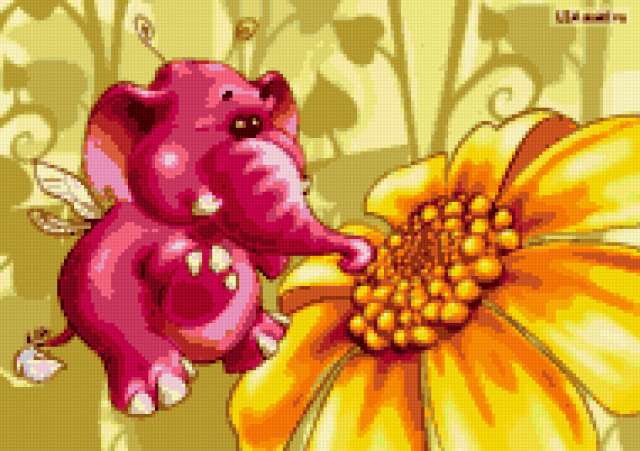 Ориентировочно так, схема вышивки «Розовый слон», созданная автором EllenS, будет выглядеть при отшиве на канве. Размер данной вышивки равен 190x134 крестов, при этом используется 34 цветов. Ключевые слова, по которым можно найти эту схему: мультик, сказка, детские, детям, розовый, слон, цветок, подсолнух, подушка. Также, вы можете взглянуть на оригинальную картинку, соответствующую данной схеме вышивки.