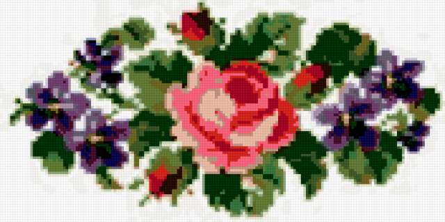 Ориентировочно так, схема вышивки «Розы и фиалки», созданная автором poltanya, будет выглядеть при отшиве на канве. Размер данной вышивки равен 176x88 крестов, при этом используется 28 цветов. Ключевые слова, по которым можно найти эту схему: розы, фиалки, фиалка, виола, душистые розы, розочки, цветы, цветочки, флора, нежные лепестки, живопись, искусство, акварель. Также, вы можете взглянуть на оригинальную картинку, соответствующую данной схеме вышивки.
